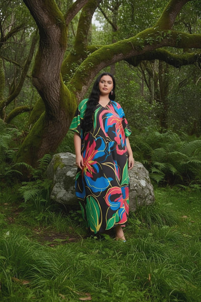 Floral Black Polyester Plus Size Vacation Caftan Dress