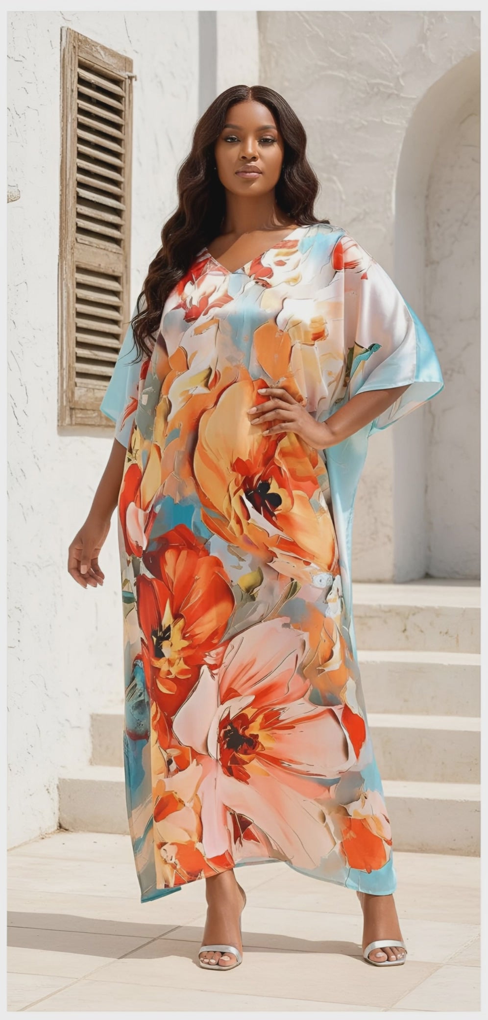Shop our stylish plus-size Satin Silk kaftan, perfect for resort wear, beach cover-ups, or loungewear. Lightweight, flowy, and comfortable, designed to flatter every body type. Ideal for summer and fashion lovers.