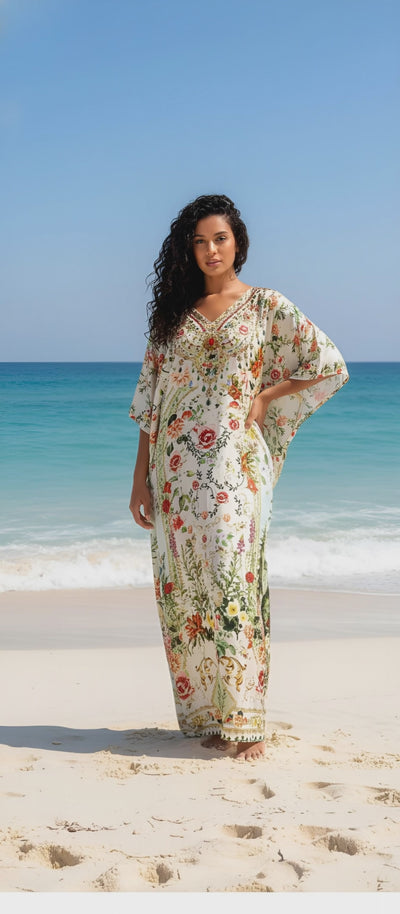 Shop our stylish plus-size Satin Silk kaftan, perfect for resort wear, beach cover-ups, or loungewear. Lightweight, flowy, and comfortable, designed to flatter every body type. Ideal for summer and fashion lovers.