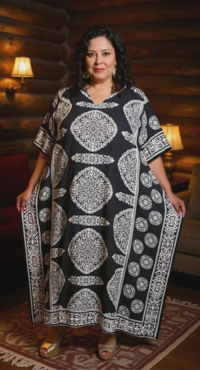 Enhance your wardrobe with our gorgeous Floral Printed Black Polyester Kaftan Plus Size Dress for women. Discover your perfect fit and style today!