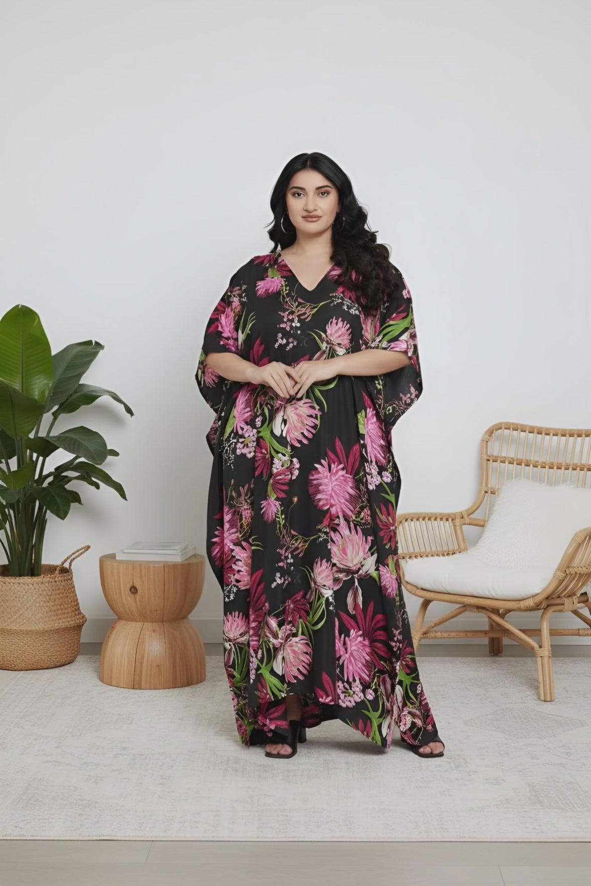 Revamp your closet with our fashionable Floral Printed Plus Size Black Polyester Kaftan Dress for women. Shop now for the latest in plus size fashion!