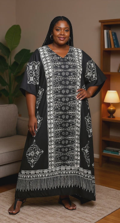 Floral Printed Black Polyester Kaftan Plus Size Dress For Women
