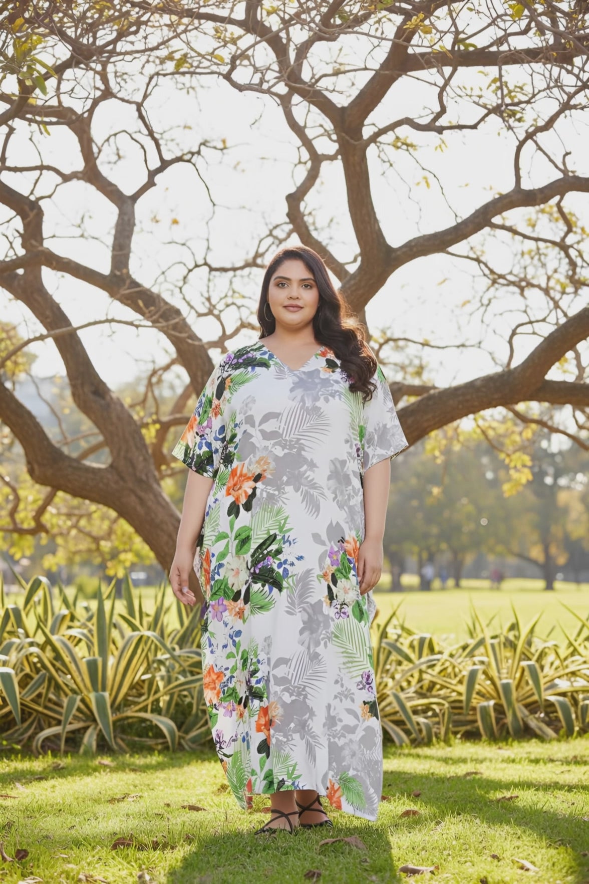 Enjoy the ultimate blend of comfort and style with our Floral Printed Multicolor Plus Size Polyester Kaftan Dresses for women. Update your wardrobe by shopping now!