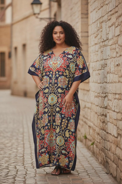 Peruse our lineup of stylish and flattering polyester dresses to locate your new preferred floral printed navy blue plus size kaftan dress for women suitable for any event.