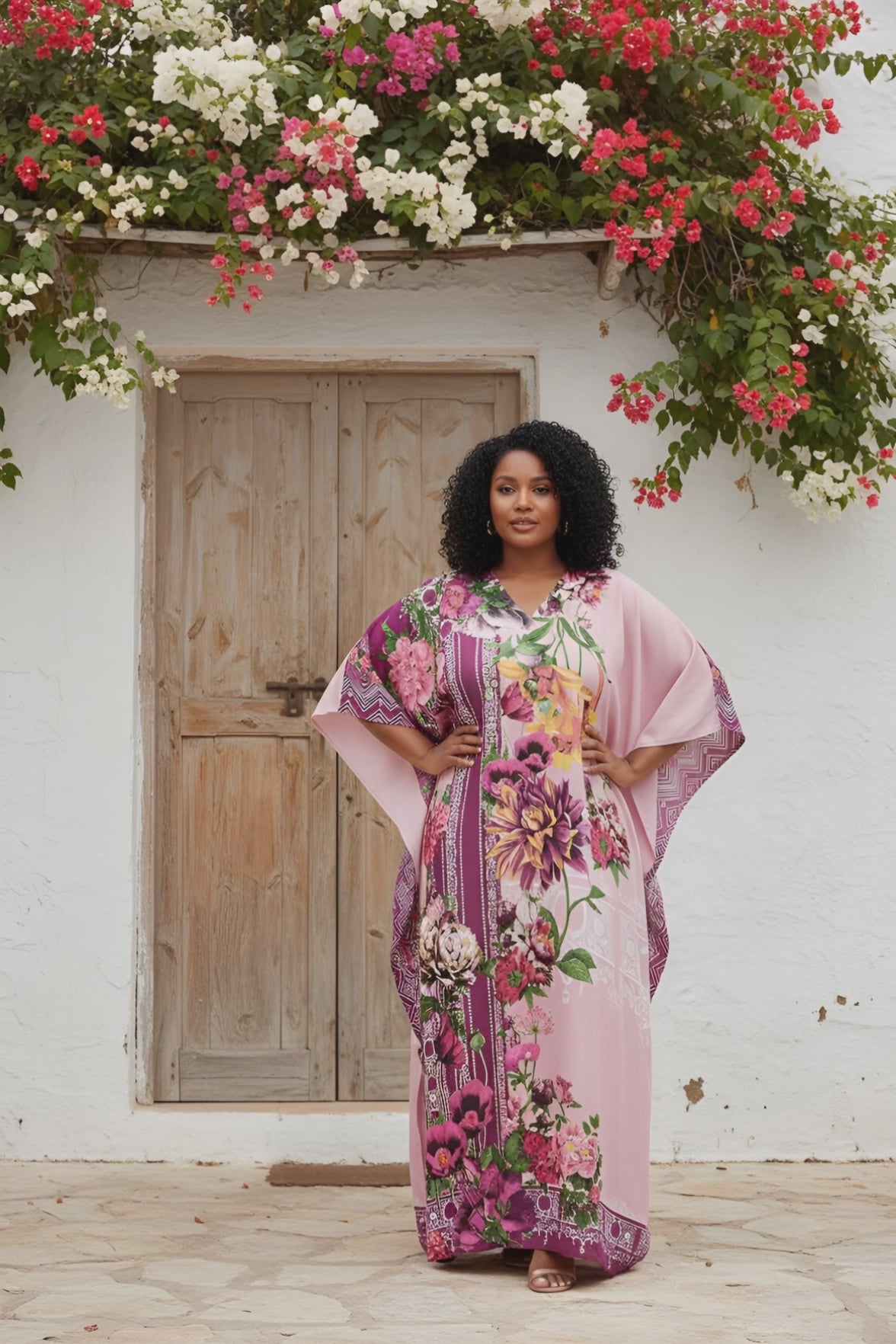 Floral Printed Pink Polyester Kaftan Plus Size Dress For Women