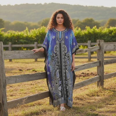 Make a statement in our Floral Printed Purple Polyester Plus Size Kaftan Dress for Women. Embrace your unique style with this must-have piece.