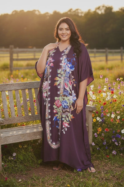 Stand out in our fashionable Floral Printed Plus Size Purple Polyester Kaftan Dress for women. Explore our selection and find your new favorite piece!