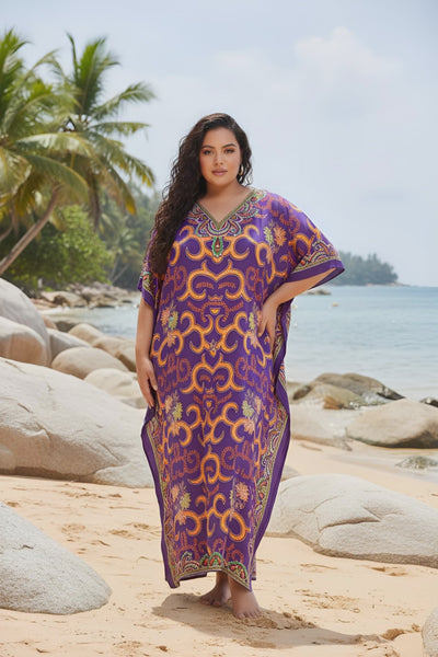 Explore the ideal combination of style and comfort with our Floral Printed Purple Plus Size Polyester Kaftan Dress for Women. Purchase now!