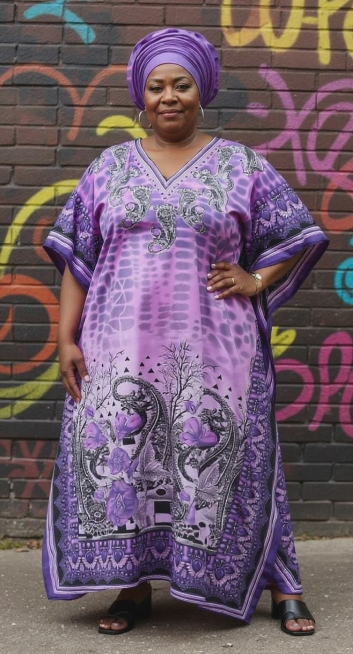 Paisley Printed Purple Polyester Plus Size Kaftan Dress For Women