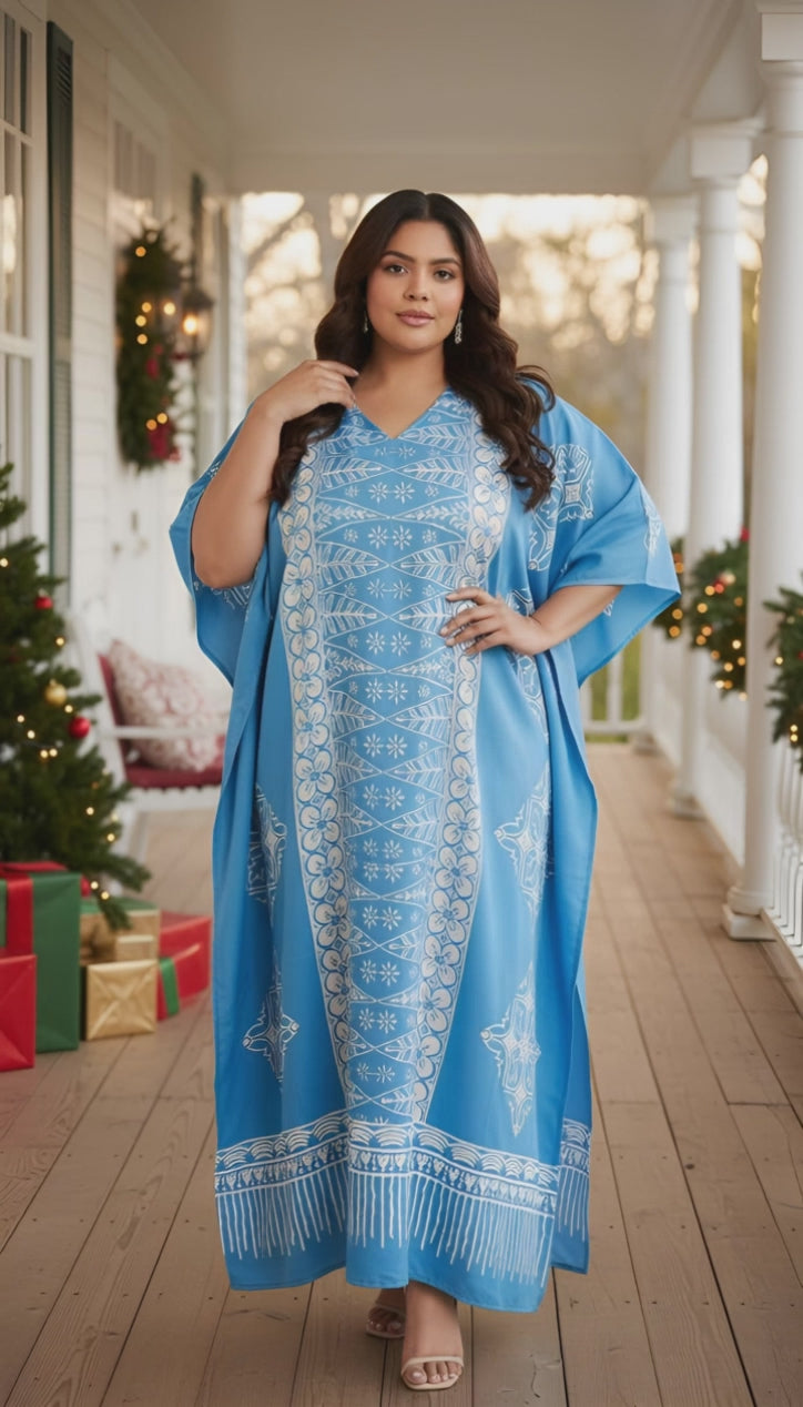 Transform your closet with our Geometric Printed Sky Blue Polyester Kaftan Plus Size Dress for Women, offering a stylish and comfortable option.
