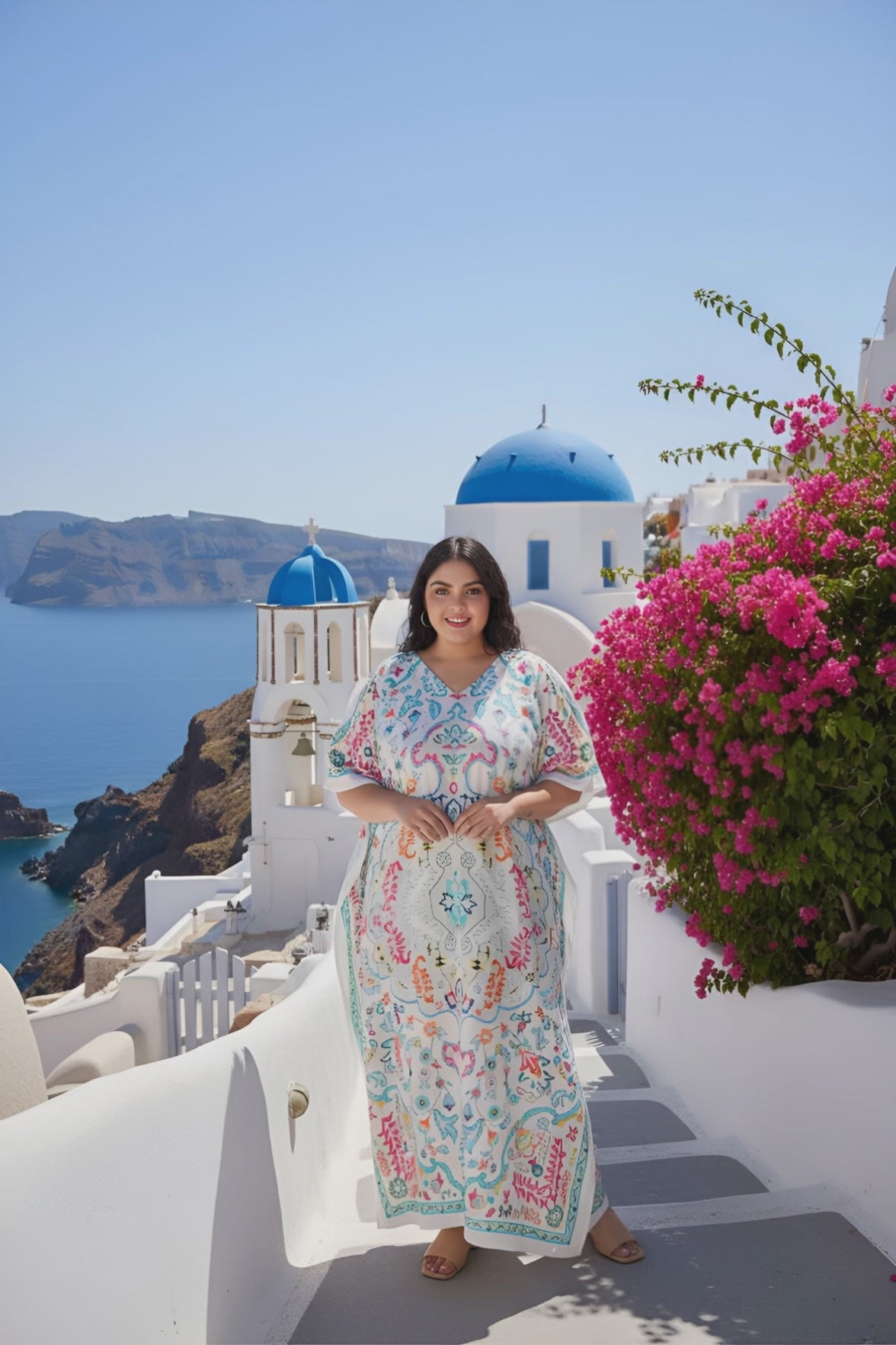 Transition into the season with our floral print white polyester plus size kaftan dress for women. Experience the perfect mix of style and comfort!