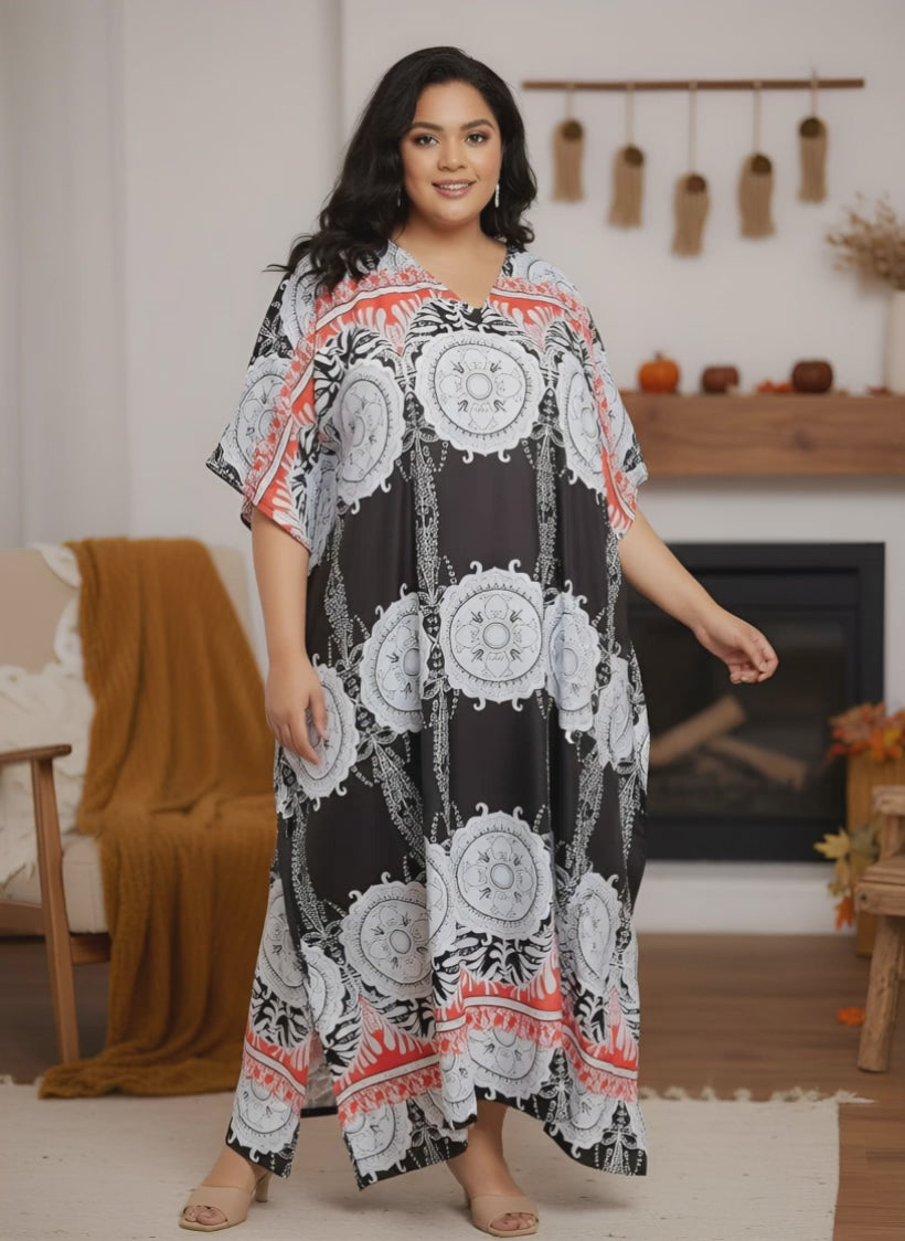 View our wide variety of geometric printed black polyester kaftan dresses for plus size women available on our website. Easily elevate your closet with these fashionable selections!