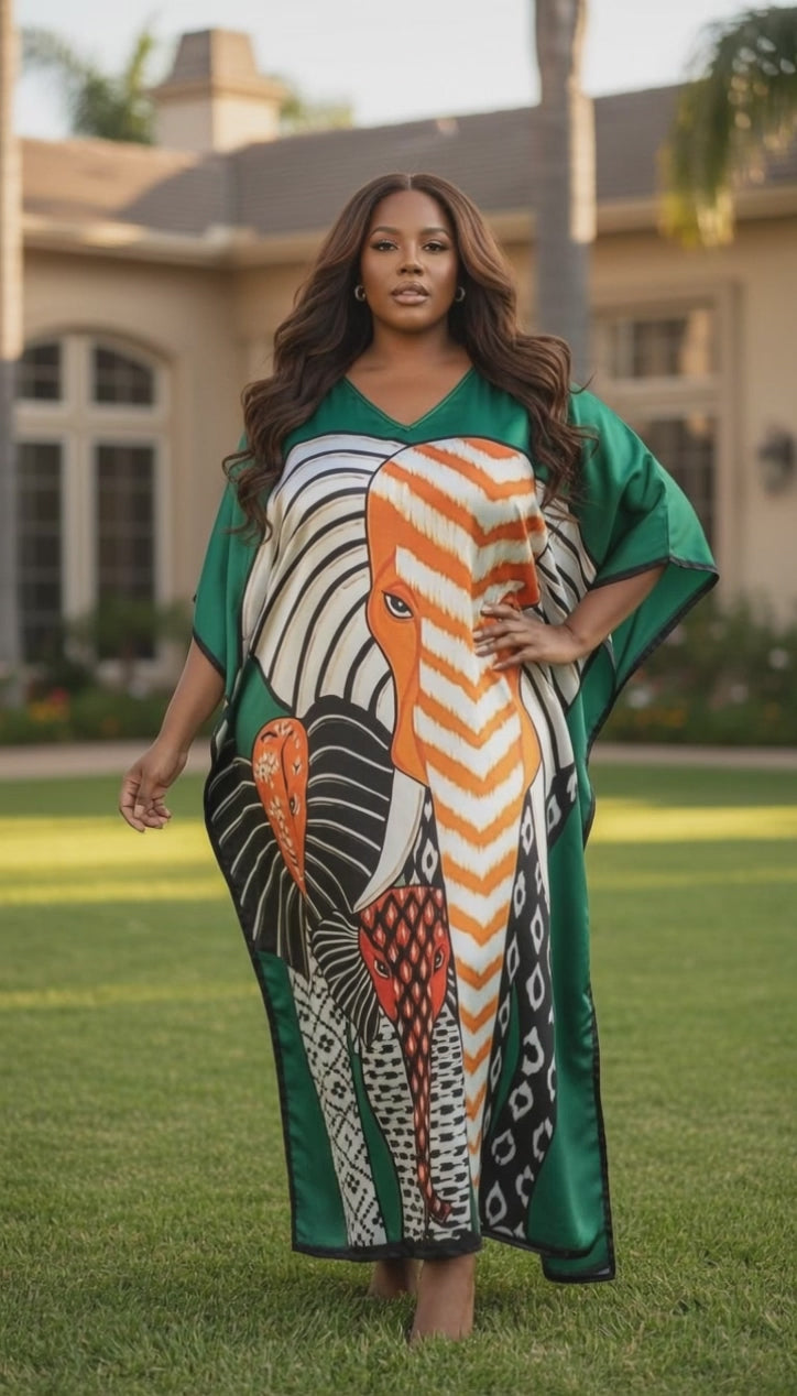 Soft satin kaftan maxi dress for women with vibrant prints and loose free‑size fit. Perfect women’s kaftan dress for beach cover up, resort holidays, casual party wear, daily loungewear and plus size comfort.