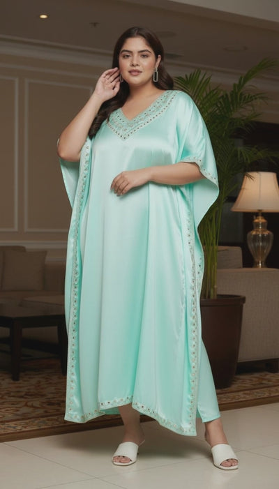 Shop for the ideal ice green lace with embroidery satin kaftan for plus size women at our online store. Elevate your fashion with our fashionable collection!