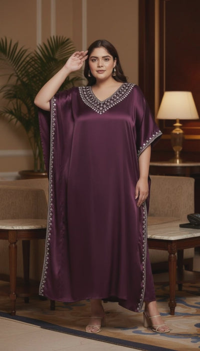 Upgrade your wardrobe with our stunning Kaftan plus size dresses, adorned with beautiful embroidery lace on wine satin fabric. Shop now!