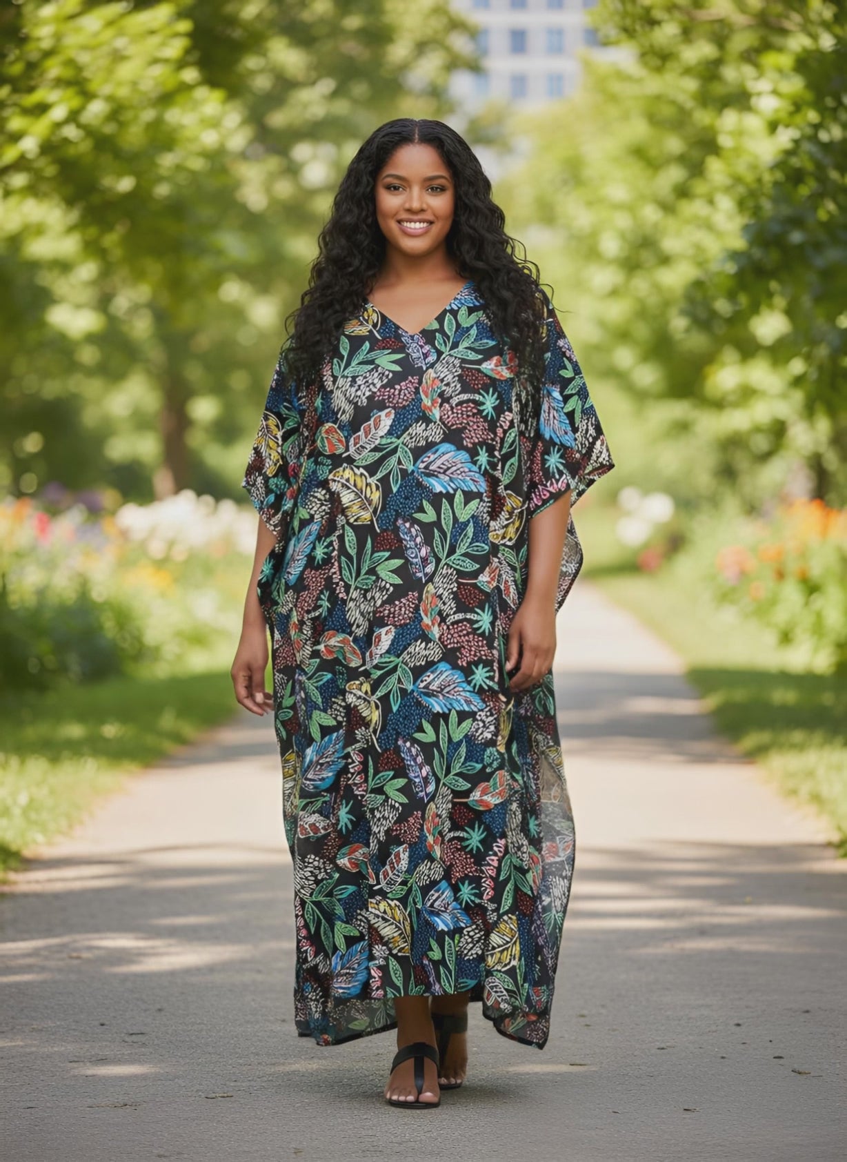 Leaf Black Polyester Women Plus Size Kaftan Loungewear Dress