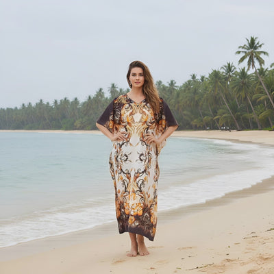Transform your appearance with our Leaf Print Brown Plus Size Polyester Digital Kaftan Dress for women. Shop now for trendy and flattering fashion selections! Description: |