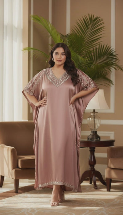 Discover your perfect Light Brown Solid Plus Size Kaftan with elegant Embroidery Lace Satin embellishments on our website. Shop now for a stylish look!
