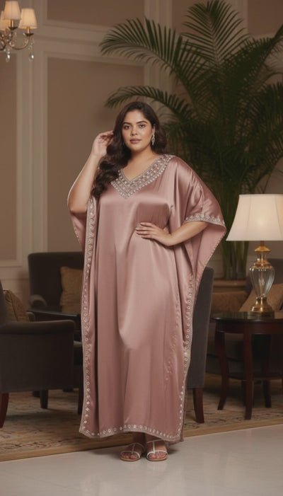 Shop for gorgeous light brown satin kaftans with intricate embroidery and lace details, specially crafted for plus size women. Find your perfect style today!