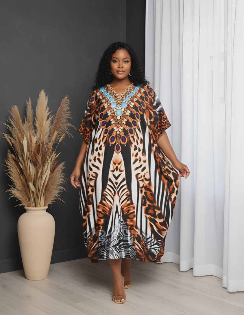 Animal Print Polyester Plus Size Long Kaftan Dress for Women