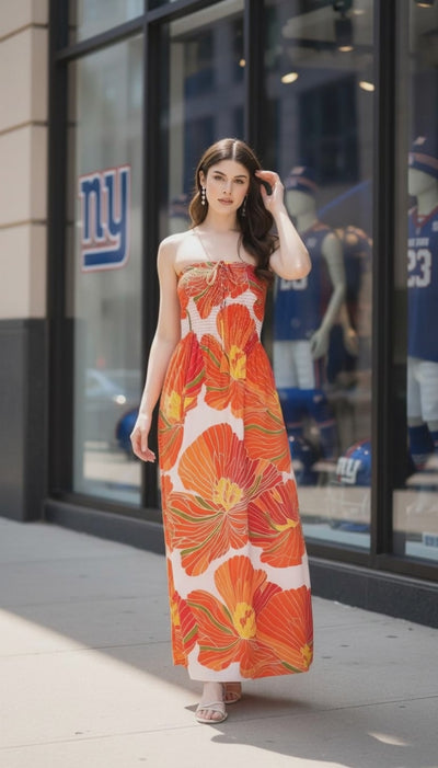 Explore the beautiful Orange Floral Elegant Strapless Women Long Tube Dress. Suitable for both daytime and evening wear, this dress features a distinctive style that captures attention.