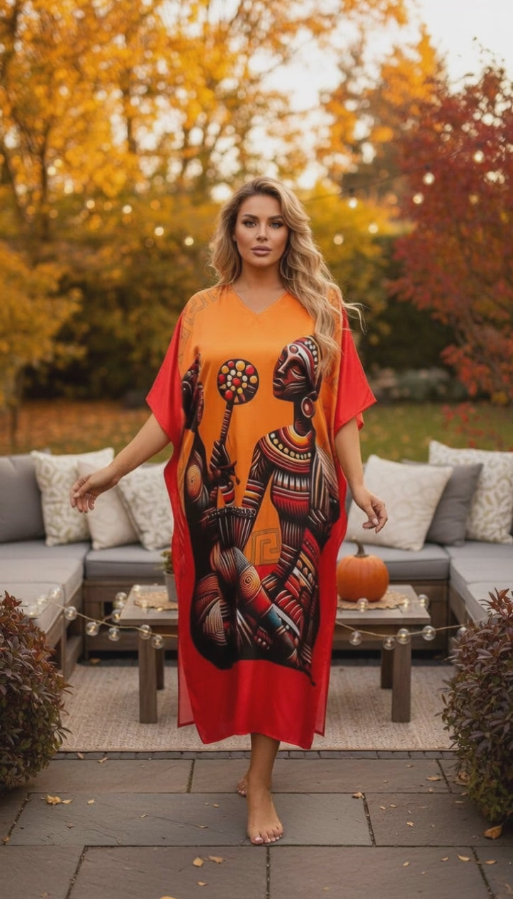 Orange Tribal Satin Women Plus Size Caftan Beach Dress