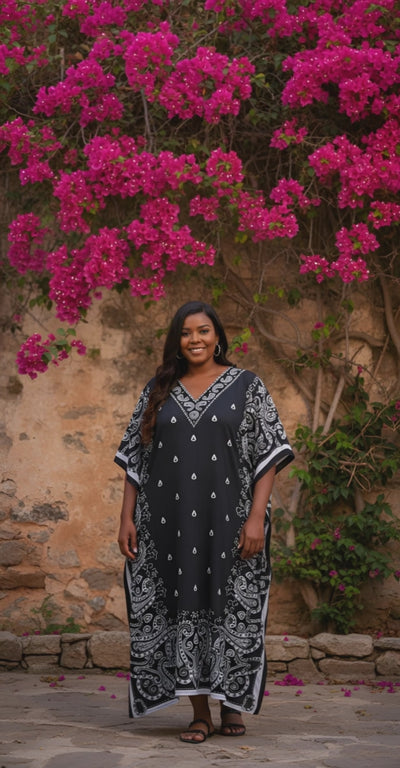 Paisley Printed Black Polyester Plus Size Kaftan Dress For Women