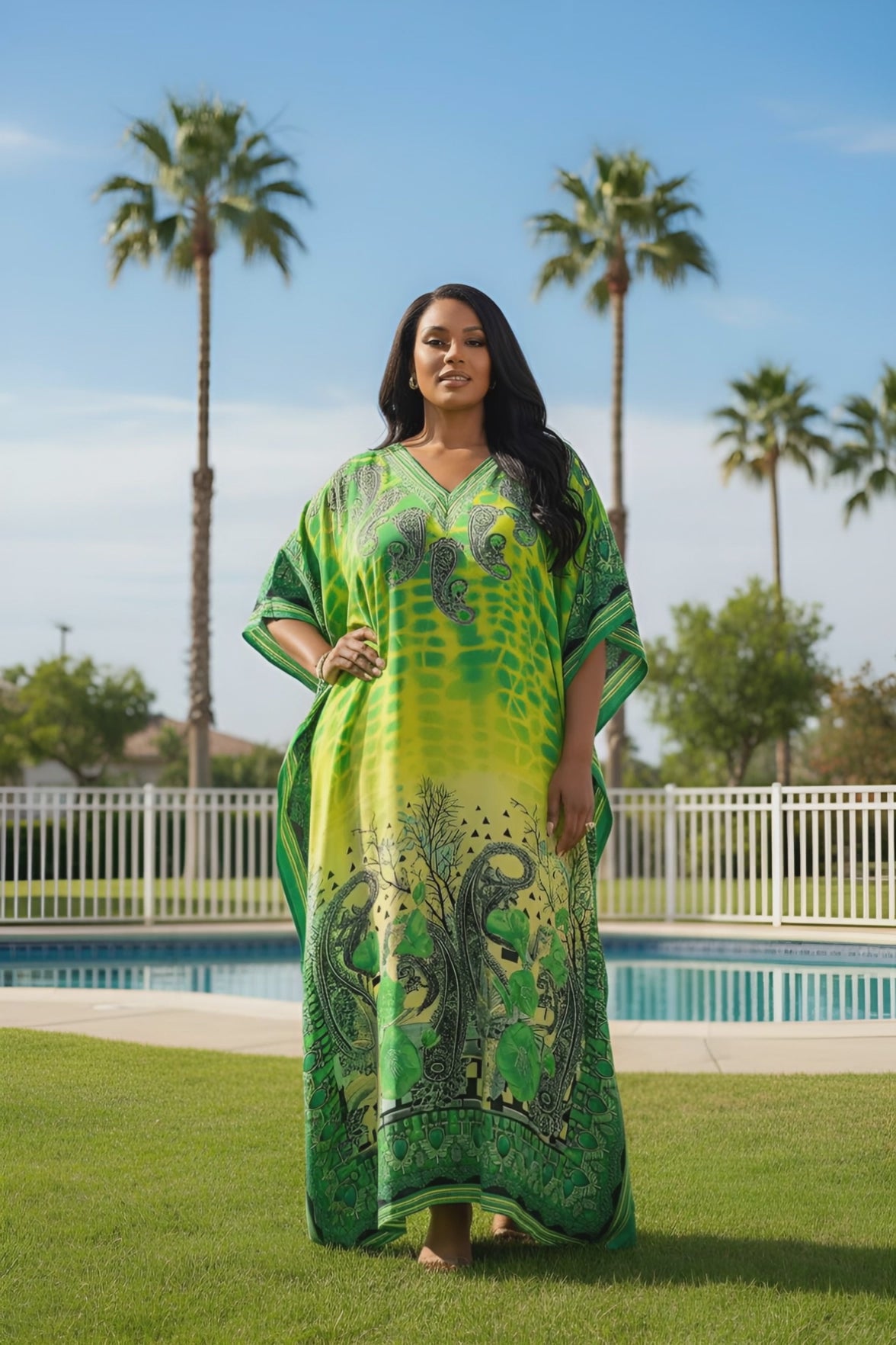 Paisley Printed Green Plus Size Polyester Kaftan Dress For Women