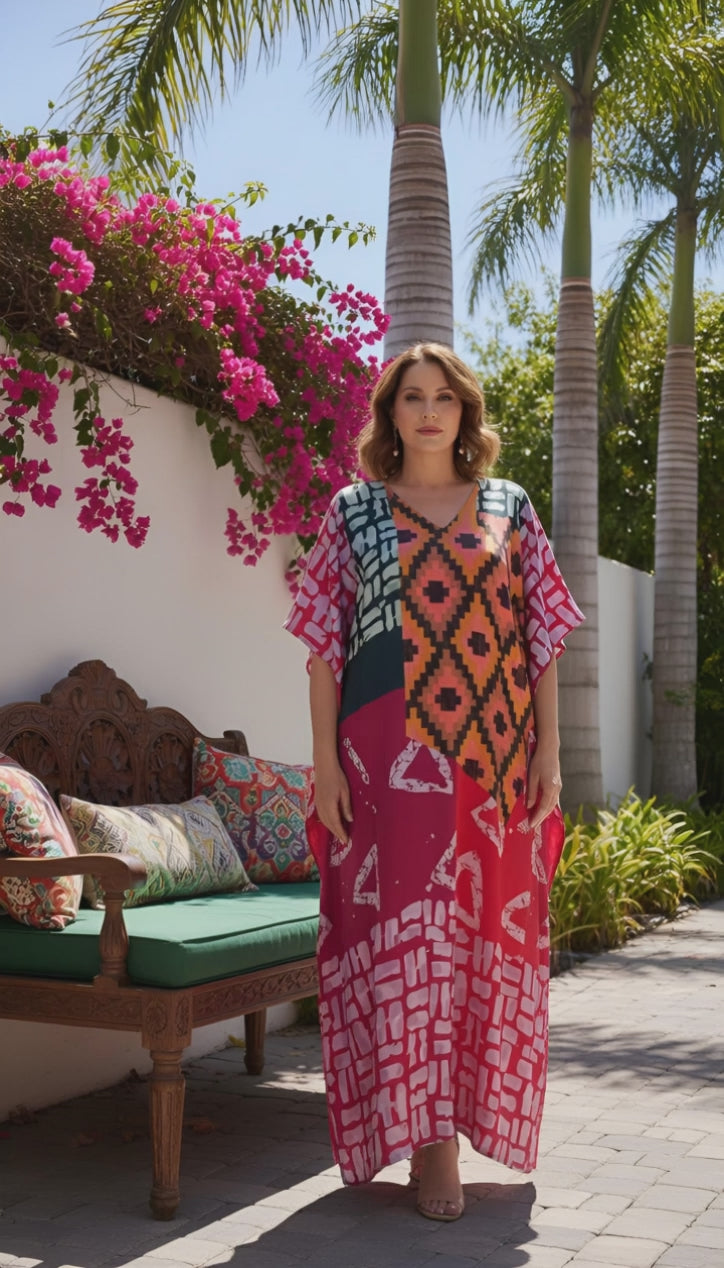 Soft satin kaftan maxi dress for women with vibrant prints and loose free‑size fit. Perfect women’s kaftan dress for beach cover up, resort holidays, casual party wear, daily loungewear and plus size comfort.