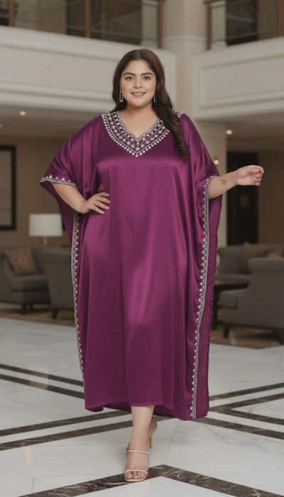 Explore our stunning selection of solid satin kaftans with intricate embroidery lace, designed specifically for plus size women. Shop now and stand out in style!