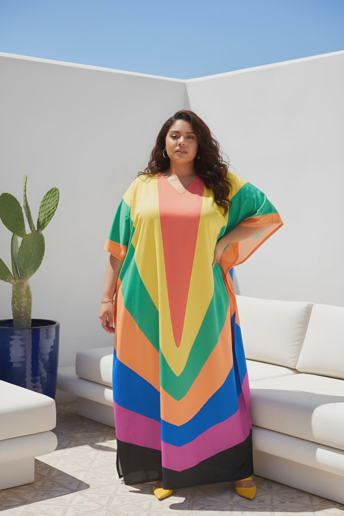 Enjoy the charm of our Rainbow Multicolor Polyester Plus Size Caftan for Women. It's an essential piece for those who appreciate style, comfort, and individuality.