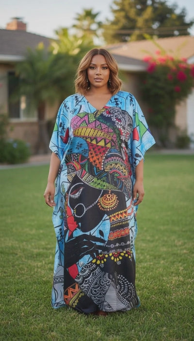 Sky Blue Tribal Lady Satin Women Plus Size Kaftan Maxi Dress African Style