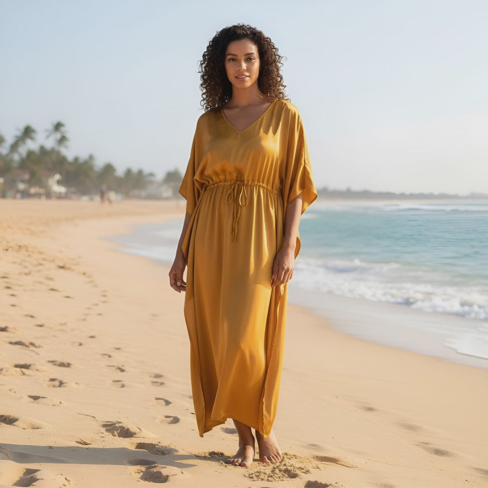 Indulge in luxury and comfort with our range of solid apricot tan satin kaftan dresses for plus size women. Shop now to feel fabulous.