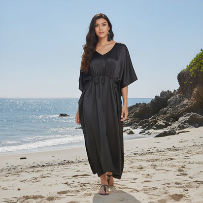 Take your style to the next level with our Solid Black Satin Kaftan Dress crafted for plus size women. Feel amazing and empowered with each stride.
