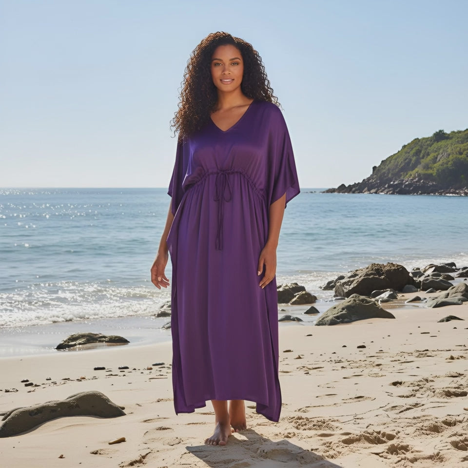Shine in the spotlight with our Solid Bordeaux Purple Satin Kaftan Plus Size Dress. Enhance your wardrobe with this gorgeous piece.