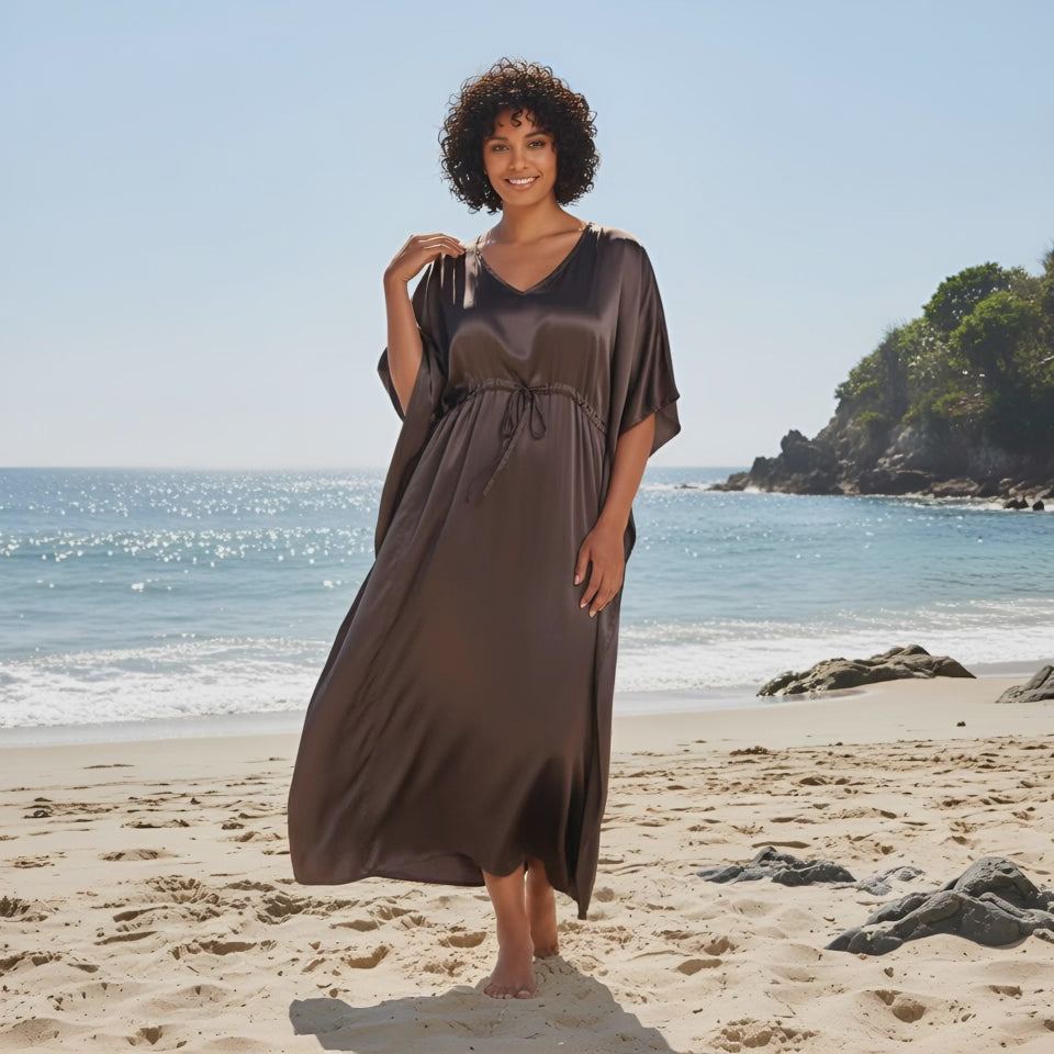 Check out our elegant and stylish women's fashion collection to discover your new favorite plus size satin kaftan dress in solid brunette brown.