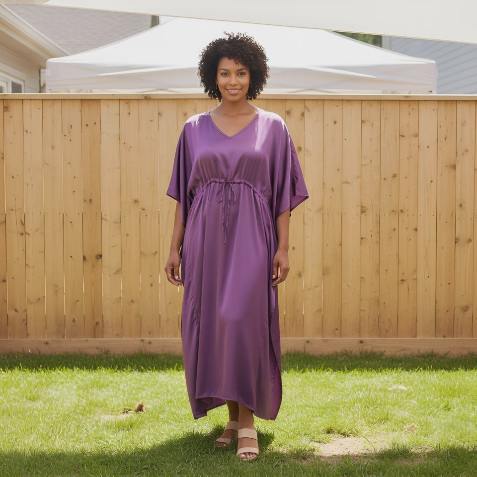 Embrace the allure of our Purple Solid Passion Satin Plus Size Kaftan Dress for women. Find the perfect combination of comfort, style, and self-assurance.