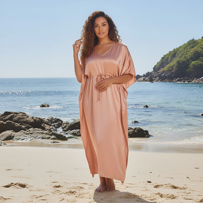 Elevate your wardrobe with our stunning plus size terracotta satin kaftan dress for women. Find your perfect fit and style today.