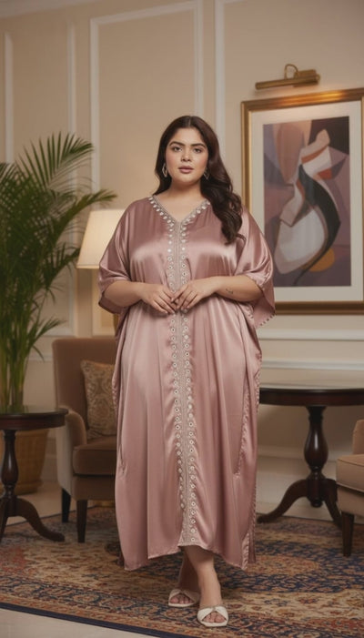 Experience luxury and style in our light brown satin plus size kaftans for women, detailed with exquisite embroidery lace for any occasion.