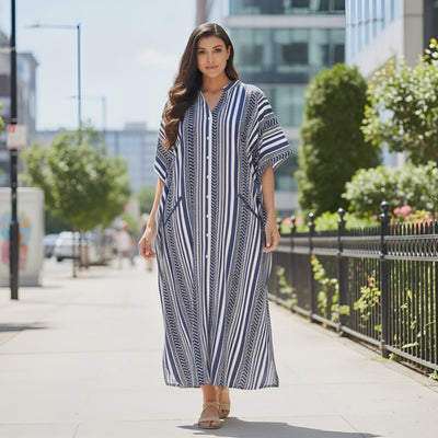 Explore our selection of plus size women's clothing, including the fashionable blue stripe print polyester button kaftan dress. Update your wardrobe with this stylish and comfortable garment.