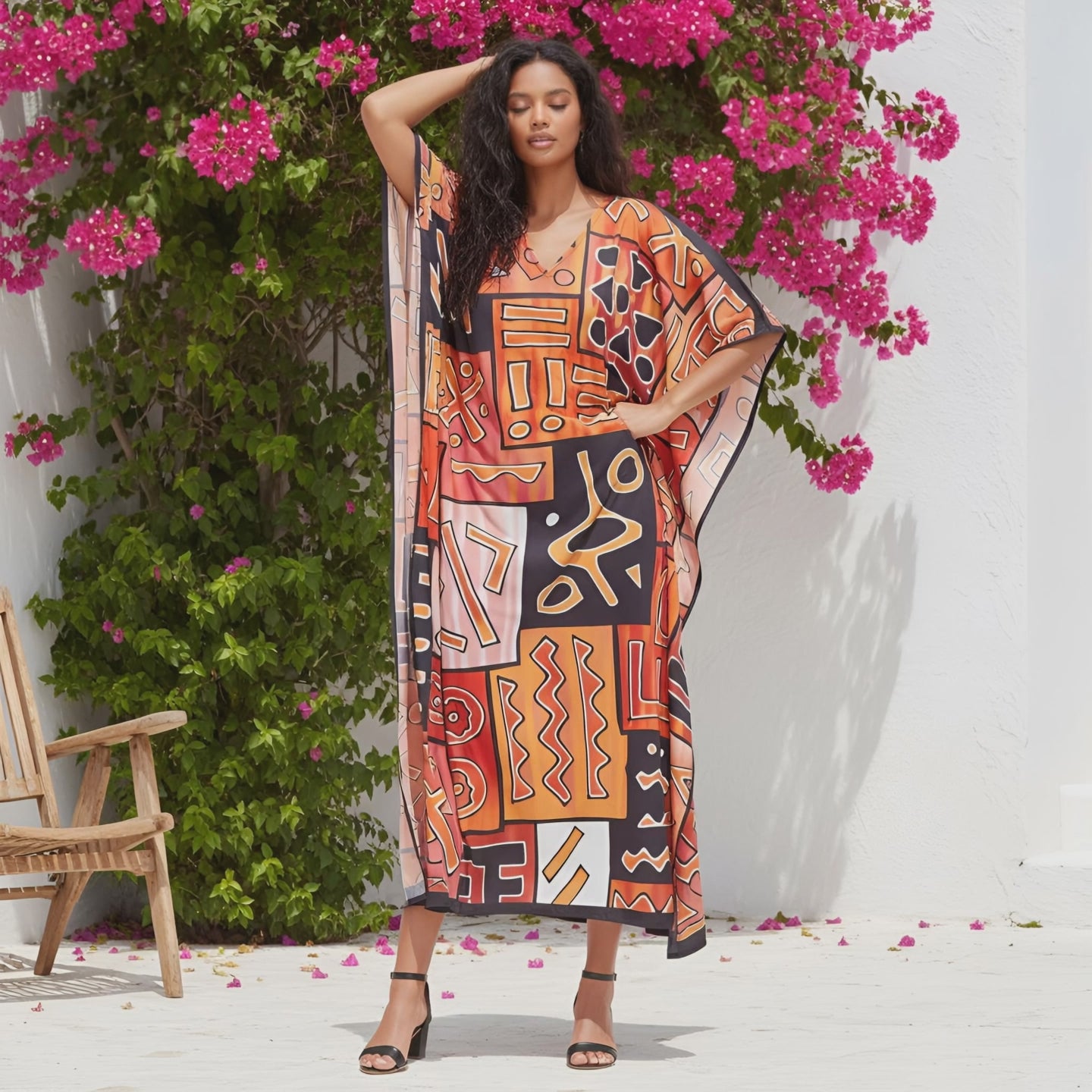 Let your inner fashionista shine with our chic brown tribal print polyester plus size kaftan for women. Shop now and express your individual style!