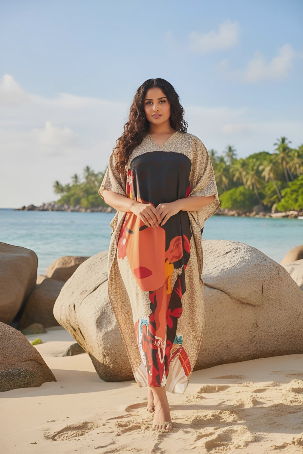 Experience the perfect combination of comfort and style with our Tribal Printed Beige Polyester Kaftan Dresses for plus size women. Shop now to showcase your individuality!