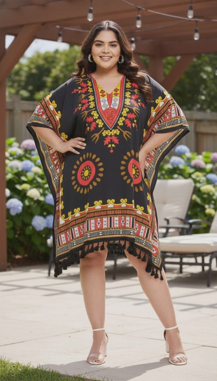 Stand out with our unique tribal printed black polyester plus size tunic for women. Shop now to make a fashion statement!