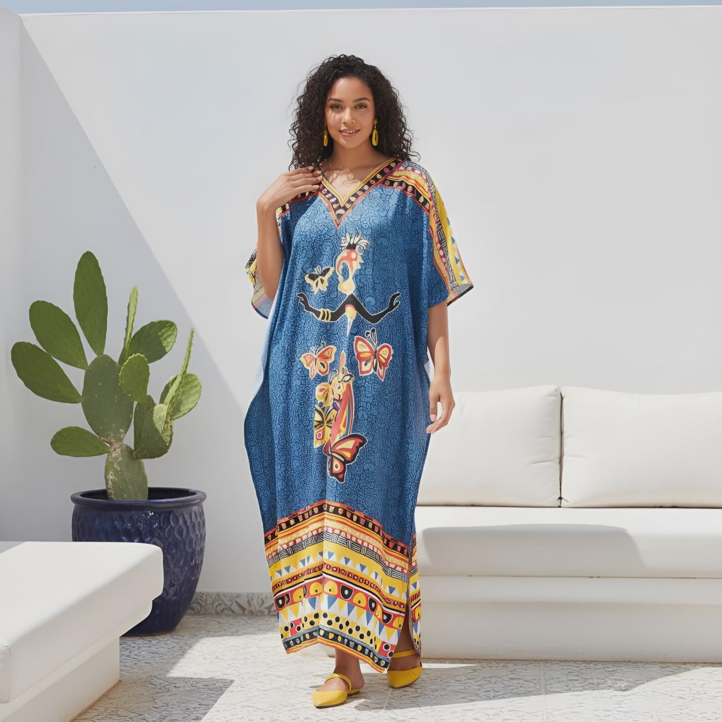 Polyester Kaftan Dress Tribal Printed Blue For Plus Size Women