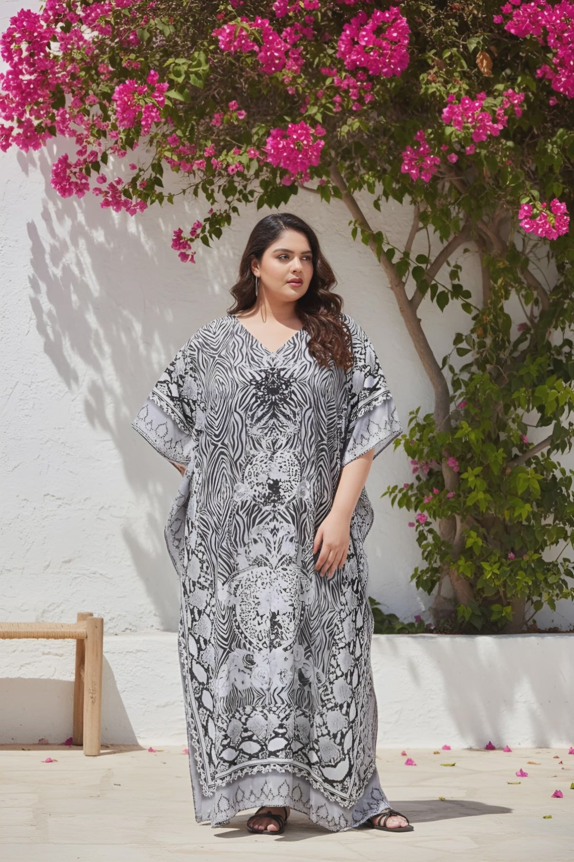 Take a look at our website to find the perfect tribal printed gray polyester kaftan for plus size women. Shop now and confidently showcase your individuality!