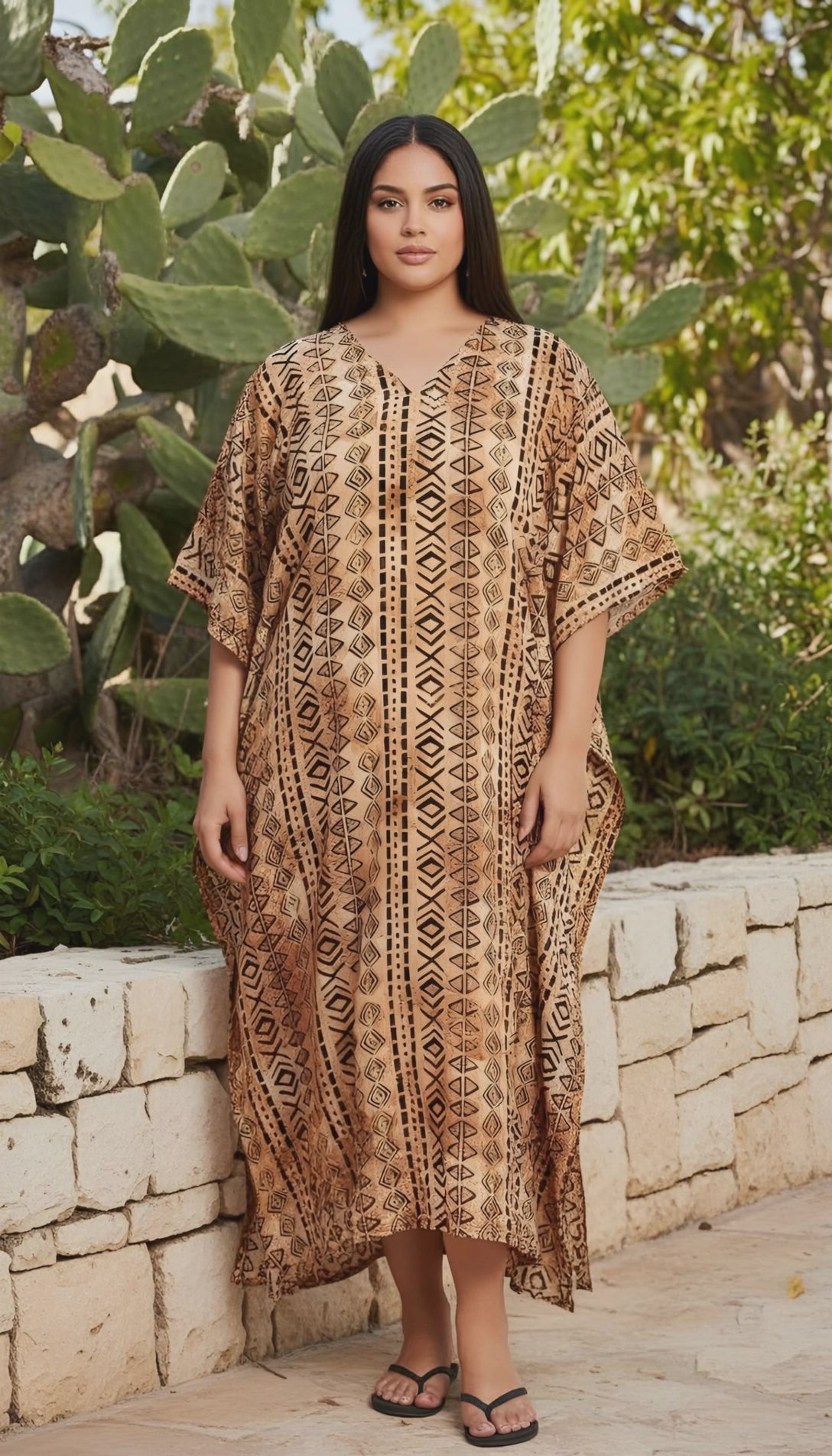 Discover the ideal Light Brown Tribal Printed Polyester Kaftan for plus size women on our website. Shop now and showcase your individuality with style!