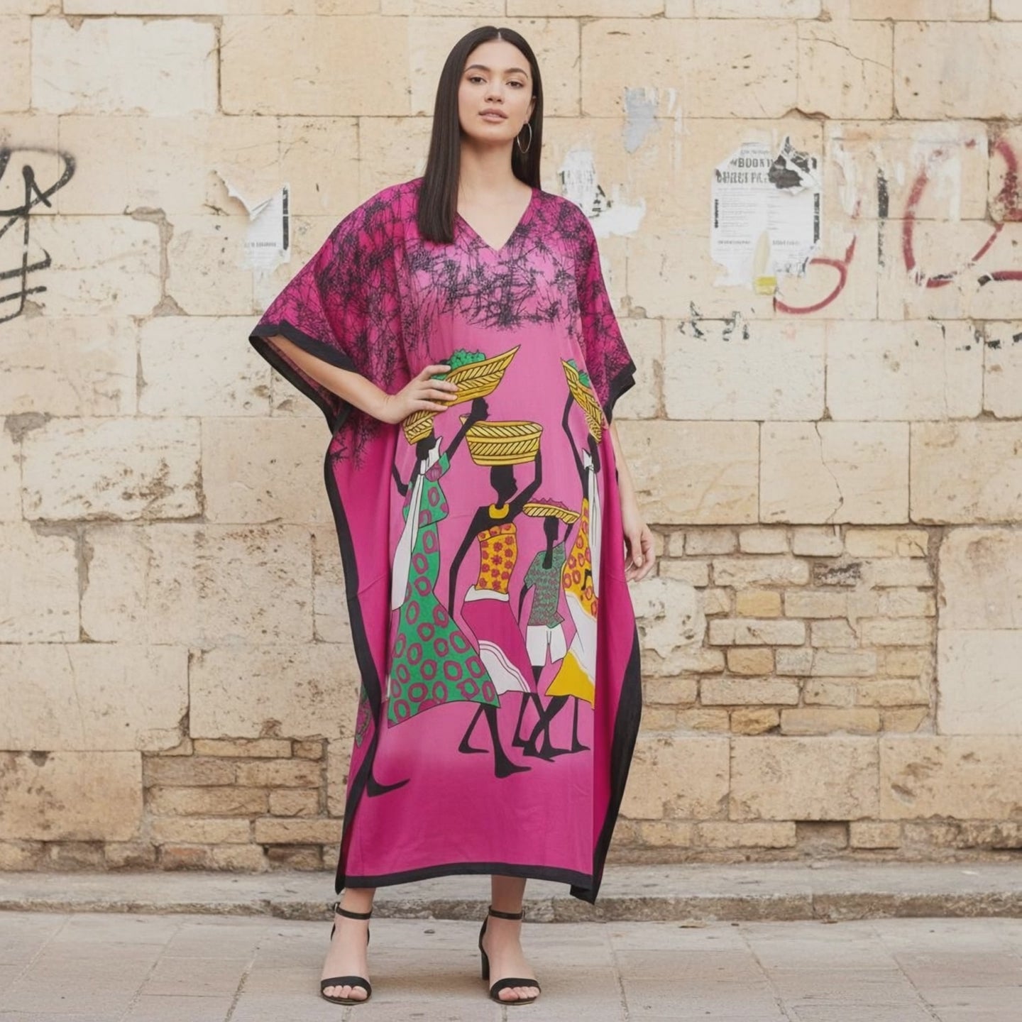 Pink Tribal Printed Polyester Kaftan For Plus Size Women