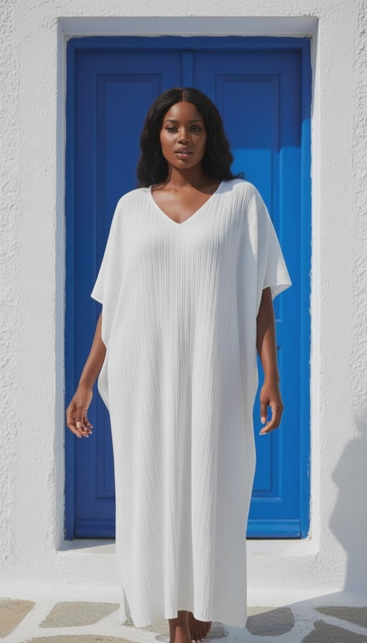 White Pleated Maxi Dress Women V-Neck Kaftan Plus Size Loose Fit Beach Caftan