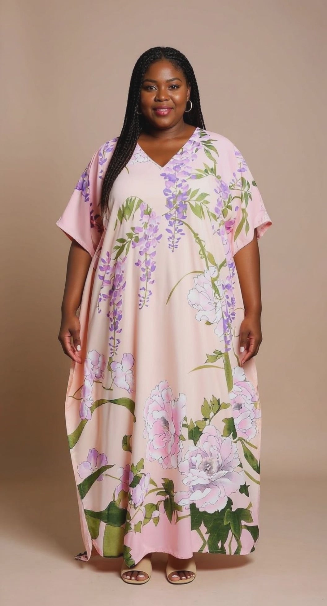 Baby Pink Floral Pattern Polyester Kaftan For Plus Size Women