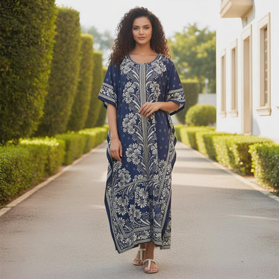 Embrace your body with our Navy Polyester Floral Print Lightweight Kaftans made for plus size women, offering stylish and flattering fashion choices.